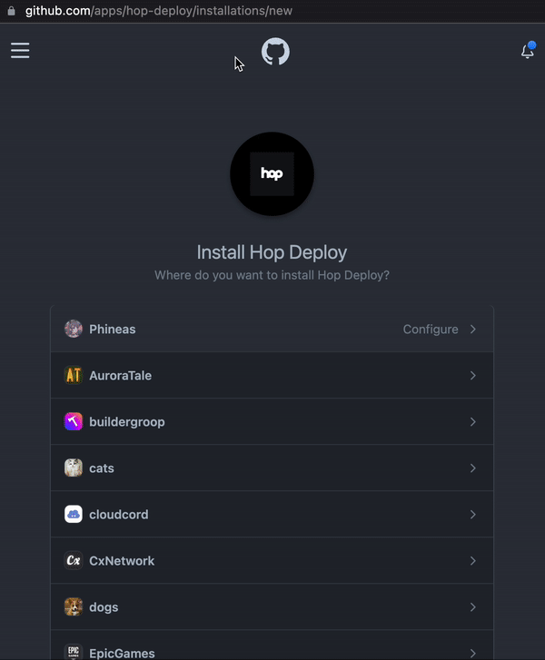 You will now be prompted to link your GitHub account to Hop. Once connected, you can give Hop permission to all or individual repositories on your account.